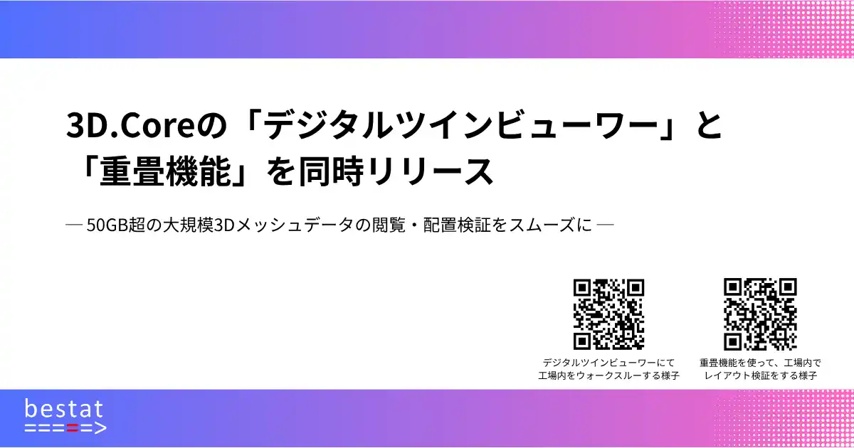 3Dデータ処理特化のbestat株式会社(本社:東京都港区赤坂、代表取締役:松田尚子、以下bestat)は、3Dデータの活用クラウドサービス「3D.Core」において、「デジタルツインビューワー」および「重畳機能」をこのたび同時リリースしたことをお知らせします。 |