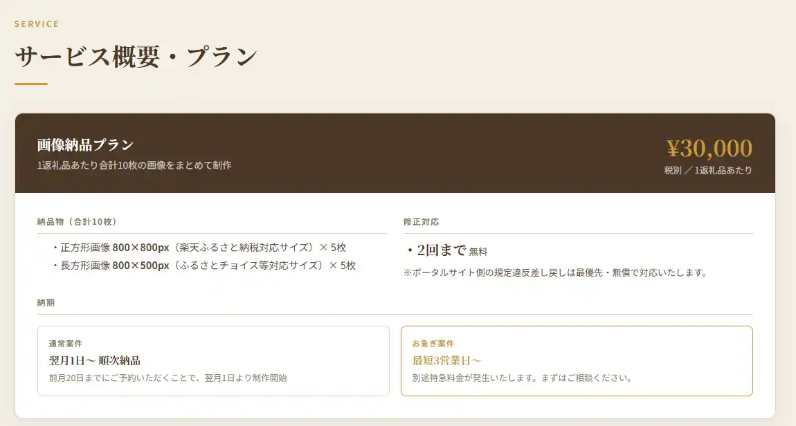 3.徹底した効率化によるコストパフォーマンス 業務プロセスの標準化により、1返礼品(10画像)3万円という低価格かつ明快な料金体系を実現しました。 |