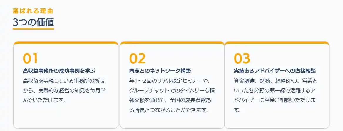 | 本会では、所長の目の届く範囲で高収益を実現されている事務所様のご講演をはじめ、資金調達、営業手法、組織運営、経理代行(BPO)の活用、リモートワーカーの活用など、多岐にわたるテーマを取り上げてまいります。 | |||