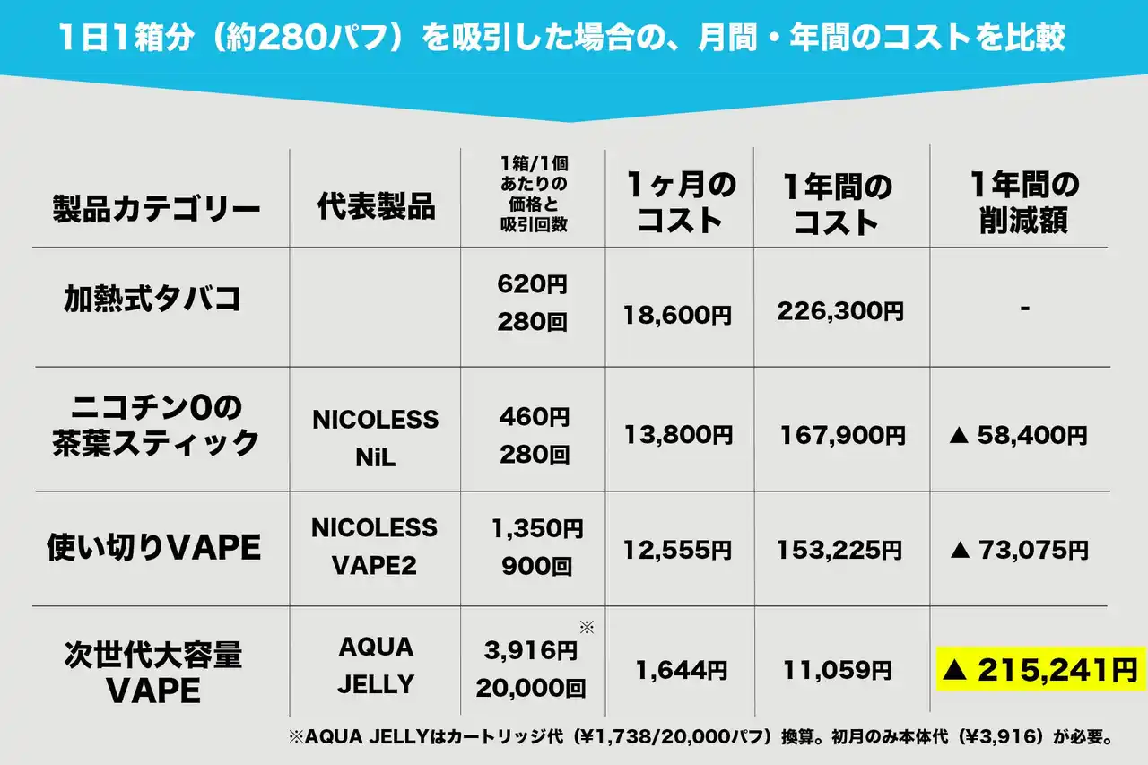 株式会社ライテック(本社:東京都台東区、代表取締役:廣田拓郎)は、2026年4月のたばこ税増税および価格改定を受け、主要な加熱式たばこおよび次世代代替製品(茶葉スティック・VAPE)のコスト比較調査を実施しましたので、その結果を公開します。 本調査により、加熱式たばこから次世代VAPE「AQUA JELLY」へ切り替えることで、年間最大215,241円の支出削減が可能であることが明らかになりました。 |
