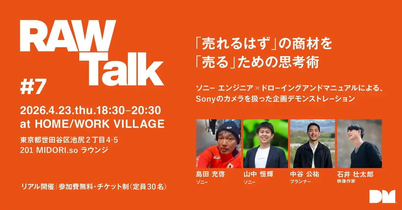 | 【RAW】 … 生(なま)の、未加工の、編集をしていないもの。映像業界では、未加工のデータをRAWデータと呼びます。DRAWING AND MANUALではクリエイティブが生まれるその前の考え方・きっかけ・出会いのような、生のトークを定期的に開催します。 | |||