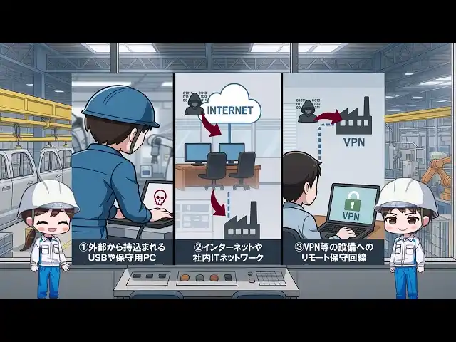 狙われやすい3つの入口 持込USB・保守PC/OA・インターネット経由/VPN・リモート保守 |