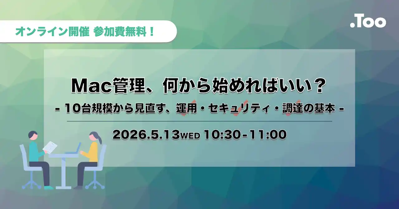 | クリエイティブ市場の総合商社・株式会社Too(本社/東京都港区虎ノ門3-4-7、社長/石井剛太、以下Too)は、オンラインセミナー「Mac管理、何から始めればいい? ー 10台規模から見直す、運用・セキュリティ・調達の基本 ー」を2026年5月13日(水)に開催します。 | |||