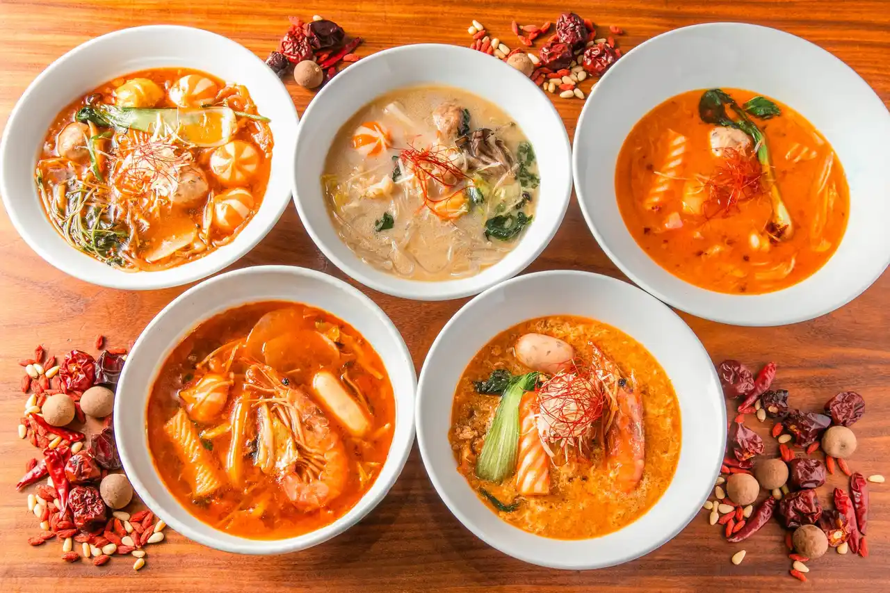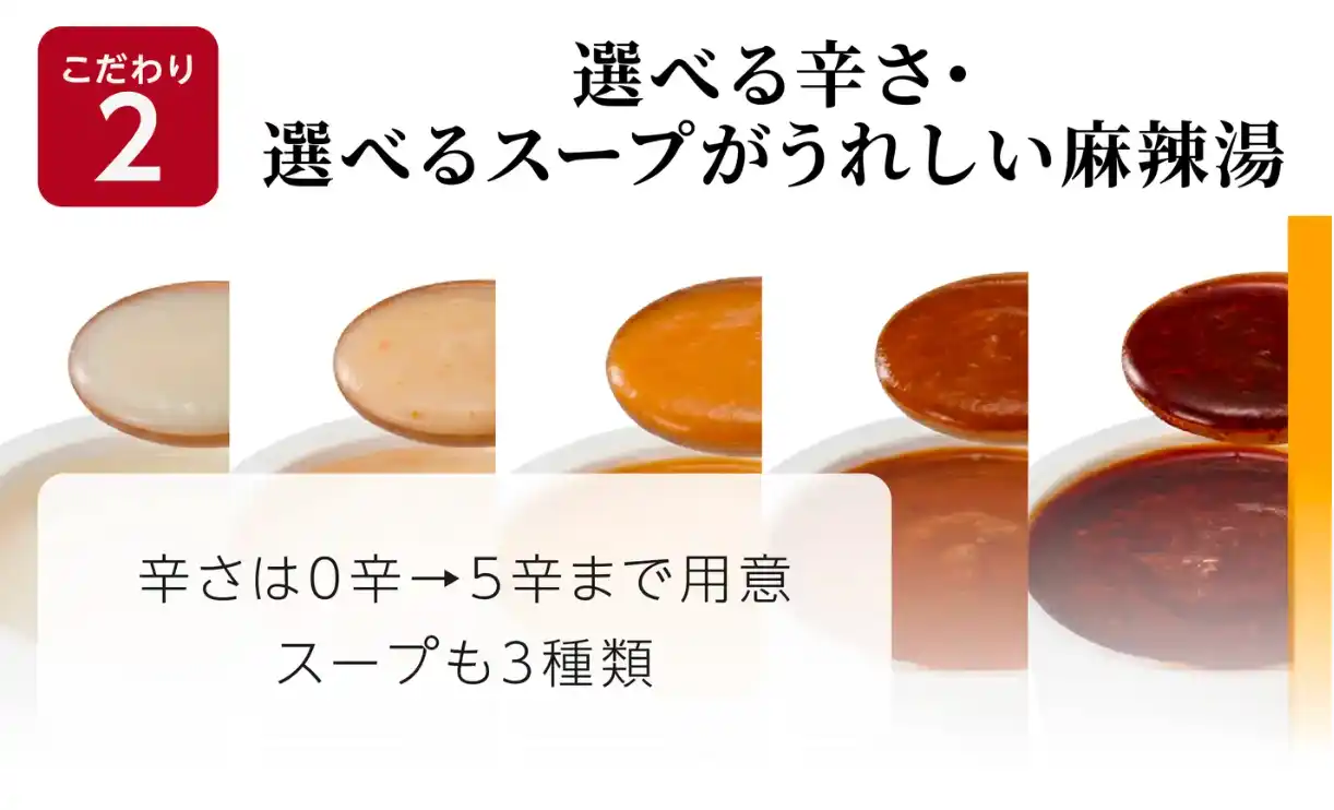 | スープは、定番の麻辣湯に加え、白湯系やトマトベースなど全4種類を用意。辛さは0辛~5辛まで選択可能で、辛いものが苦手な方から本格志向の方まで幅広く楽しめます。 | |||