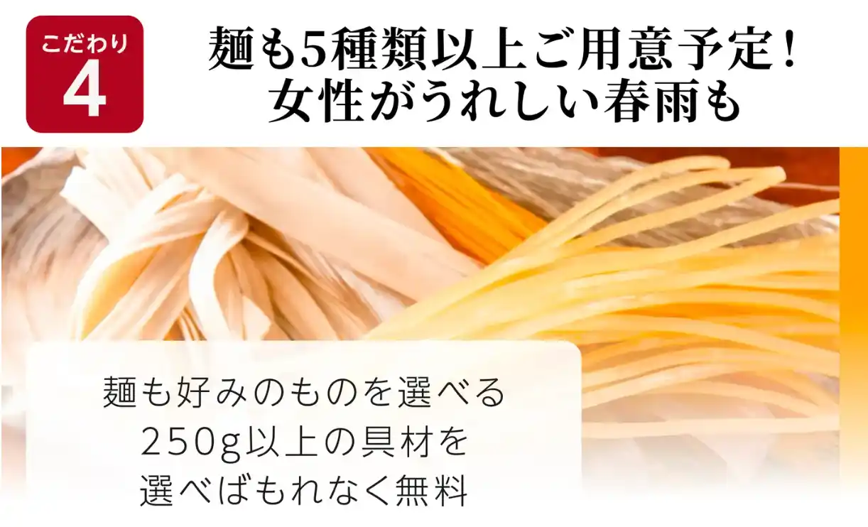 | 店内には、野菜・きのこ・肉・海鮮など60種類以上の具材を取り揃え、お客様自身で好きな食材を選び、好みの一杯をカスタマイズできます。 | |||