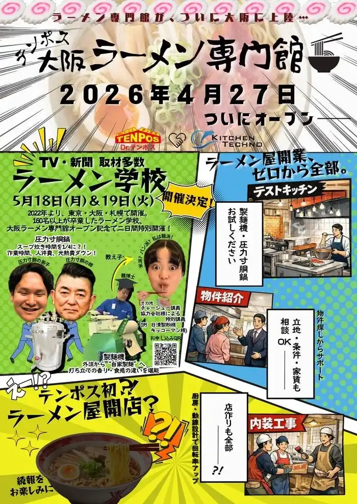 中古厨房機器の国内最大手、株式会社テンポスバスターズ(本社:東京都大田区、代表取締役社長:森下篤史)は、先行して展開している「東京ラーメン専門館」では、これまで多くのラーメン店の開業や経営改善を支援してきました。その実績とノウハウは、原価高や人手不足が続く現在の市場環境においても活かせると考え、西日本での展開として、2026年4月27日(月)、大阪市に新たな拠点「大阪ラーメン専門館」をオープンします。大阪ラーメン専門館は、圧力寸胴や製麺機などラーメン店向け専門機器を手がけるグループ会社・株式会社キッチンテクノ(本社:東京都新宿区、代表取締役社長:森下和光)との共同運営により、中古機器から新品の専門機器まで、店舗の状況に応じた幅広い選択肢を一拠点で提供します。 |