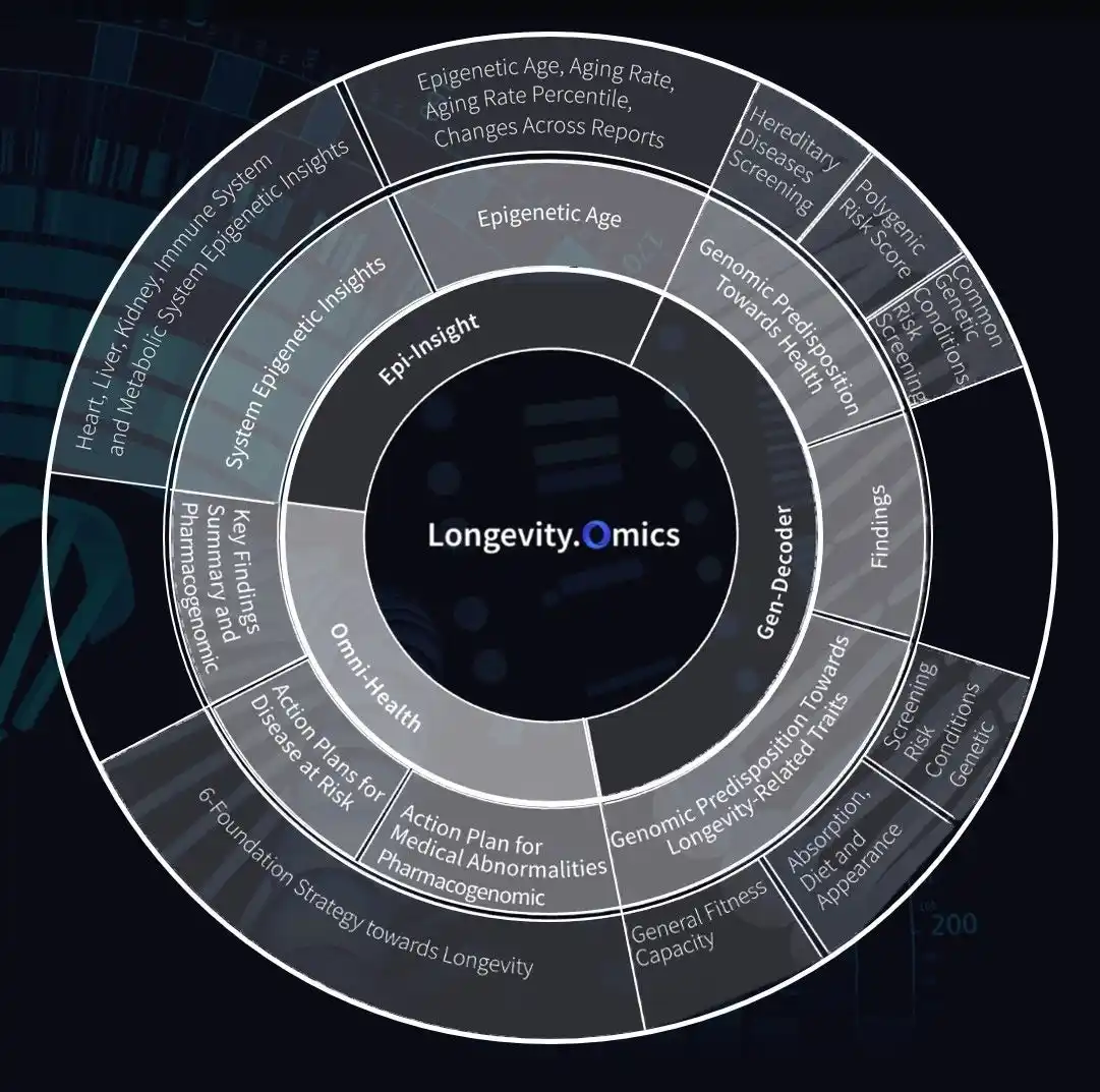 Omni-Health(AI統合介入戦略) 上記2つのデータに臨床バイオマーカーを加え、AIが数千万件の医学文献を参照して、個別の栄養、運動、睡眠、サプリメント、医療フォロー等の介入プランを生成します。 |