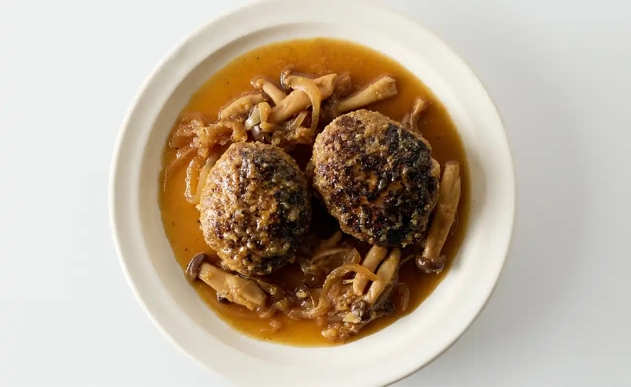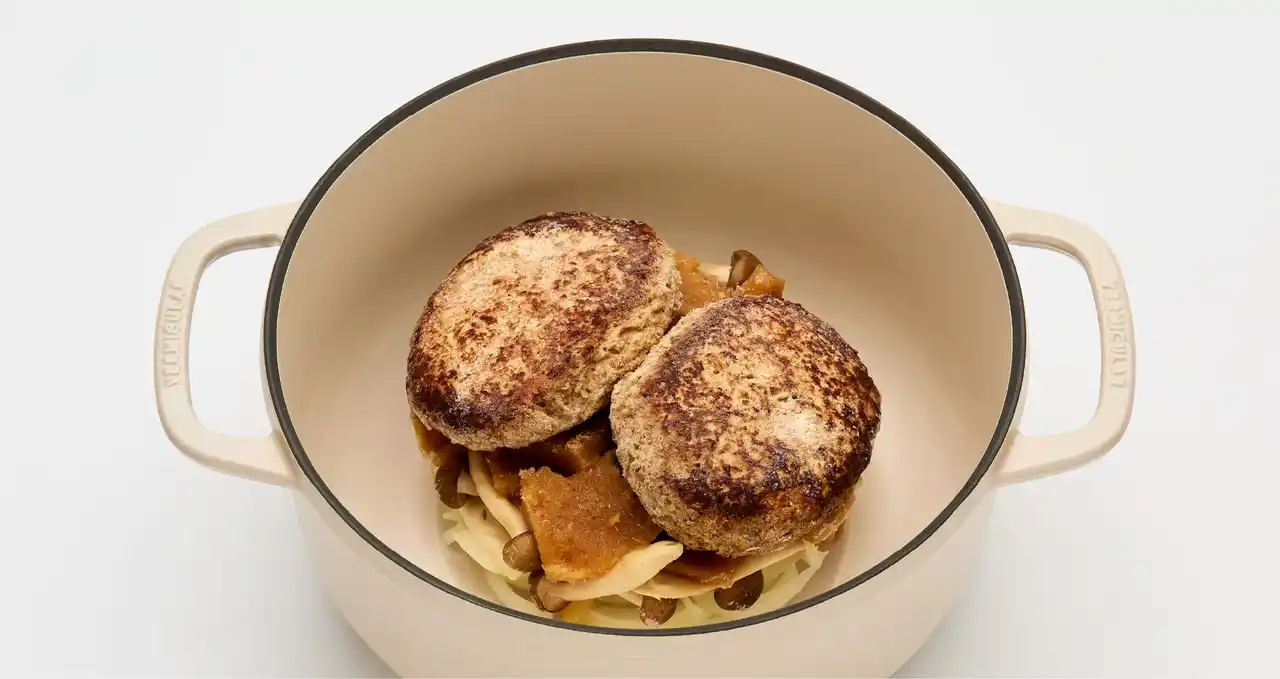 バーミキュラの無水調理で仕立てる、肉汁あふれるハンバーグ。一番のこだわりは、ハンバーグをあらかじめ一つ一つバーミキュラ フライパンで香ばしく焼き付け、旨みを閉じ込めてから冷凍していること。冷凍とは思えないふっくら食感を実現しました。お肉のジューシーな旨みと玉ねぎ、きのこの甘みが溶け込んだソースが口いっぱいに広がります。付け合わせがセットなのも嬉しいポイント。 |