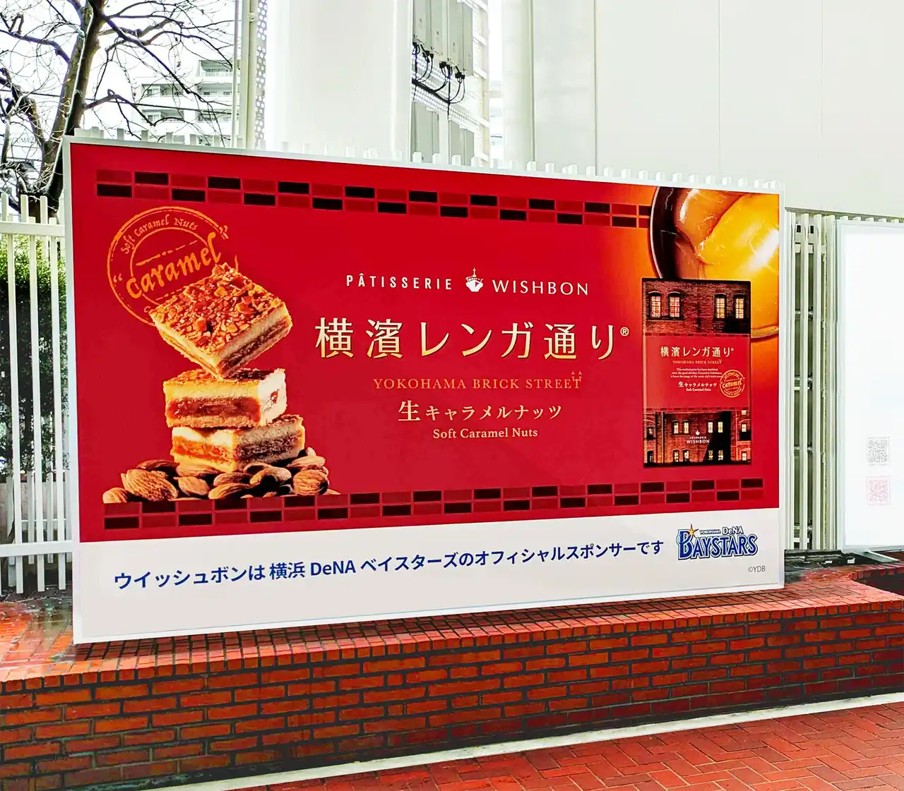 横浜スタジアム外周Yデッキ(5ゲート向かい)に、ウイッシュボンの立て看板を設置。スタジアムへ足を運ぶファンの皆様の、勝利を願う熱い気持ちに寄り添い、観戦のひとときを彩る存在になればと願っております。 |