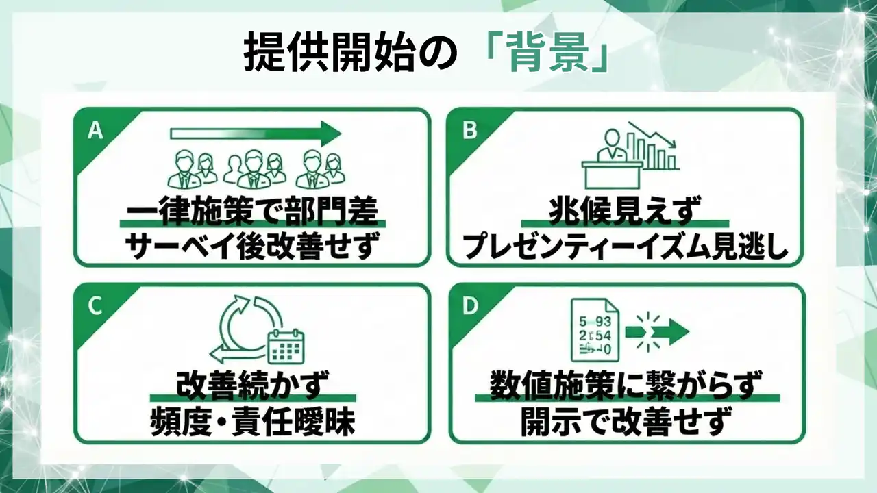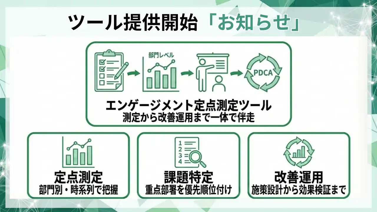 本ツールは、エンゲージメントを「測定→課題特定→施策→効果検証」の運用に落とし、離職率低下や生産性向上に影響し得る論点を継続管理するために設計しました。 |