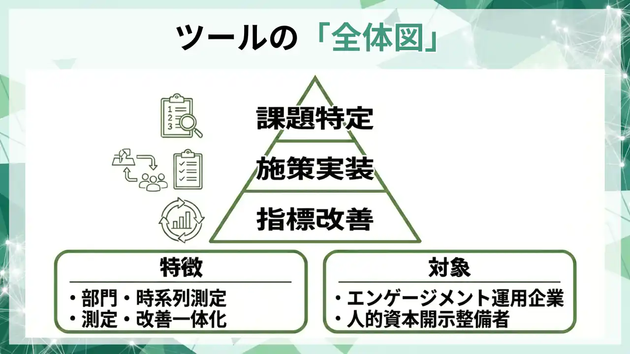 本ツールは、個人特定を目的とせず、組織単位での集計を前提に、エンゲージメント領域を運用として回すための仕組みです。 |