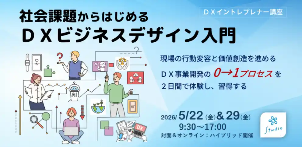 | 株式会社エンパブリック(本社:東京都文京区、代表取締役:広石拓司)は、企業の事業部でDX推進を任された新任担当者を主対象に、「社会課題からはじめるDXビジネスデザイン入門(DXイントレプレナー講座)」を、2026年5月22日(金)・29日(金)の2日間、ハイブリッド(会場+オンライン)で開講します。 | |||