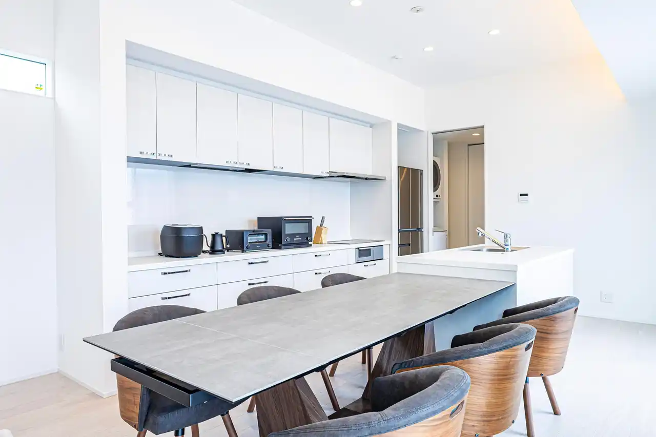 ゆとりあるダイニングテーブルと開放的なキッチン空間 |