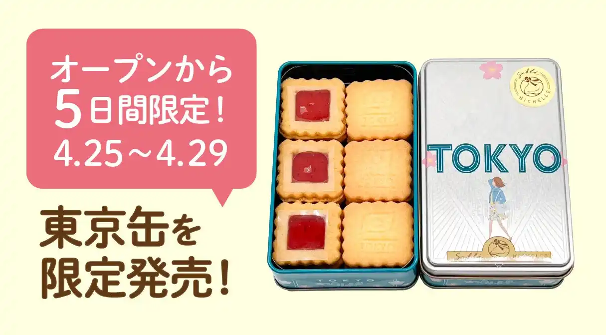 大丸東京店のリニューアルオープンに合わせてオープンから5日間、特別仕様の東京限定缶を数量限定で販売いたします。果実の甘酸っぱいイチゴジャムサンドと卵サブレの入った特別仕様の東京限定缶を数量限定で販売致します。 |