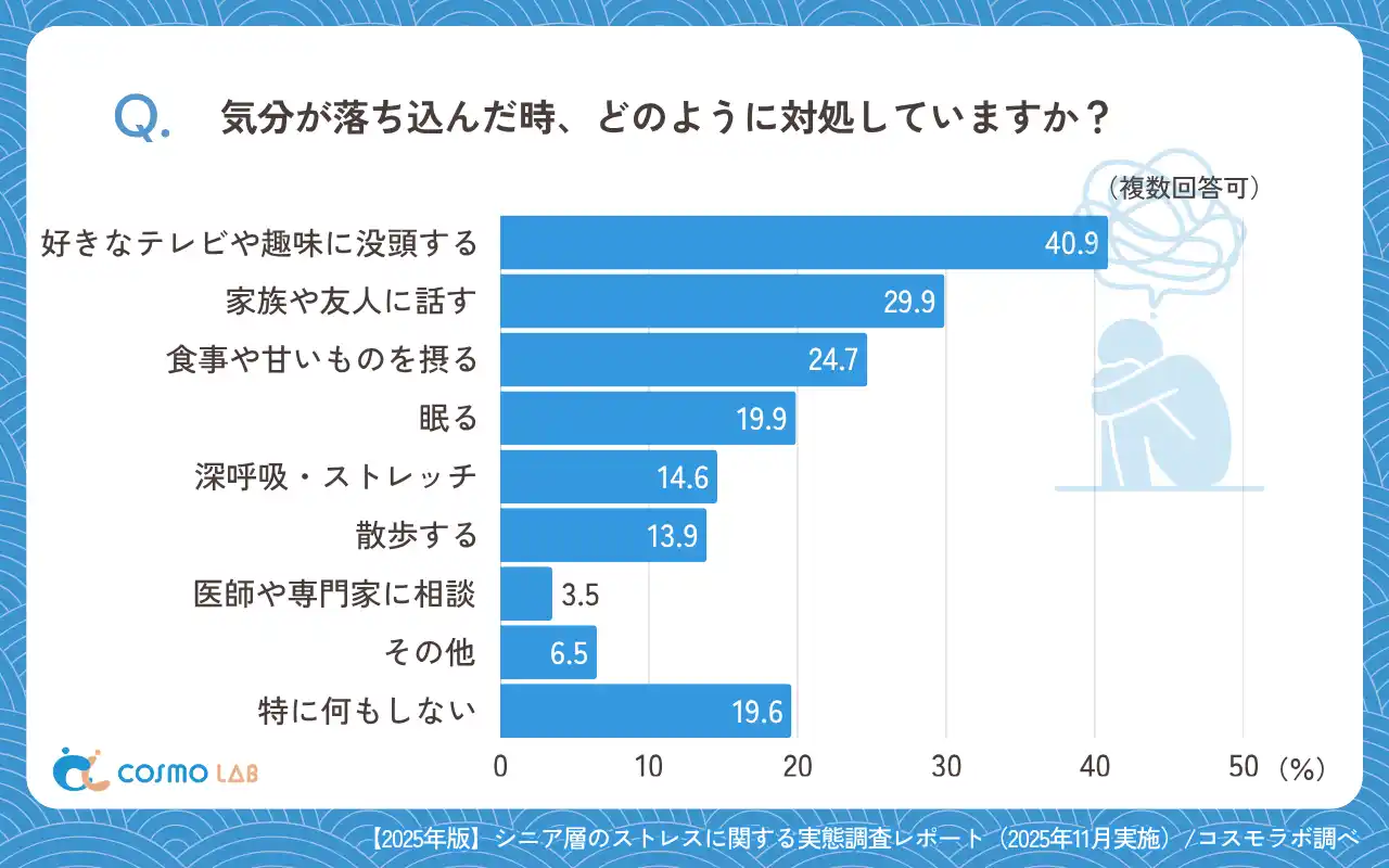 「好きなテレビや趣味に没頭する」(40.9%)と回答した層が最多で、「家族や友人に話す」(29.9%)が続きました。 |
