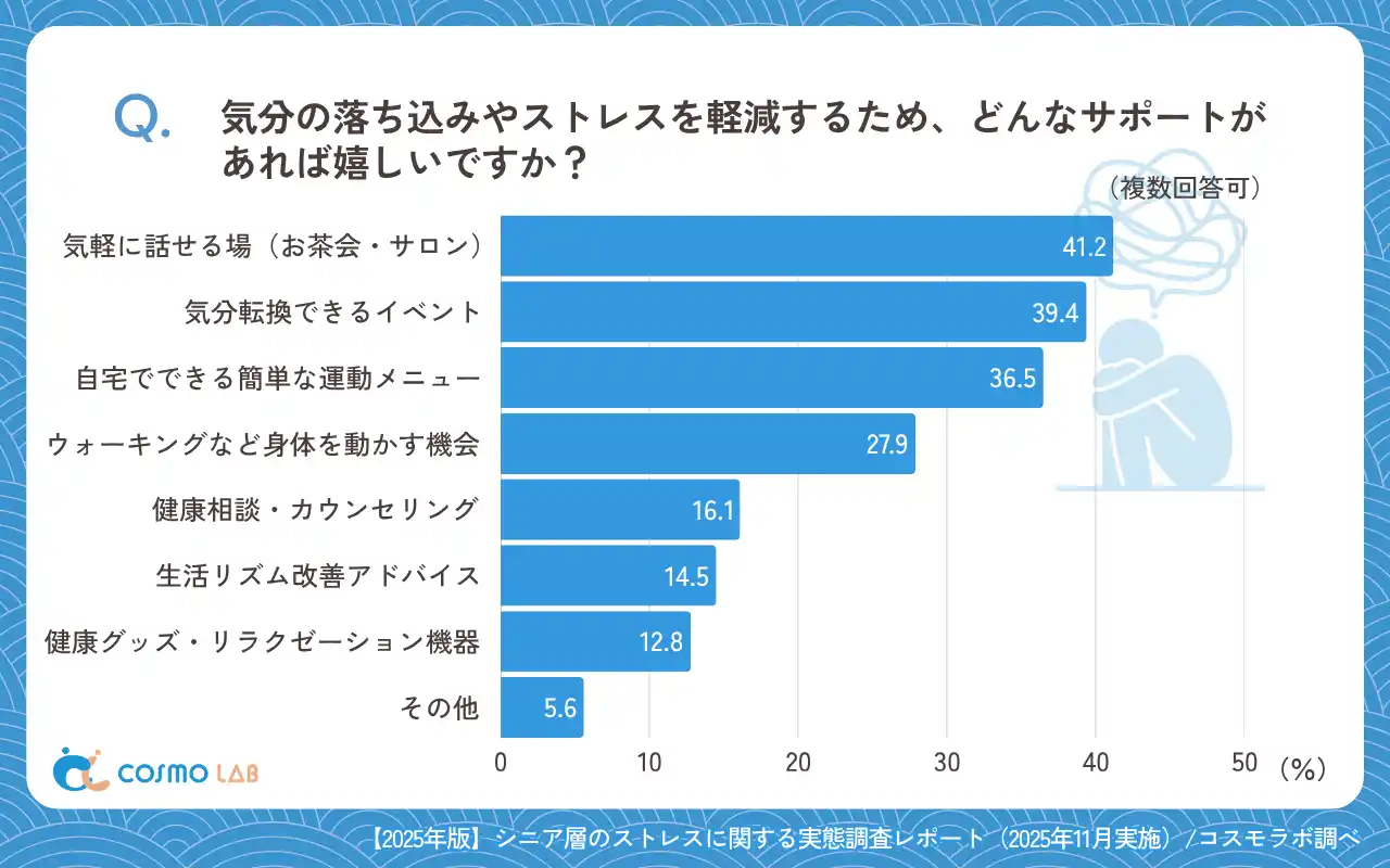 ストレスの改善に向けて望む支援は「気軽に話せる場(お茶会・サロン)」(41.2%)が最多でした。さらに「気分転換できるイベント」(39.4%)、「自宅でできる簡単な運動メニュー」(36.5%)という回答が続きました。交流と軽い運動が軸だと分かりました。 |