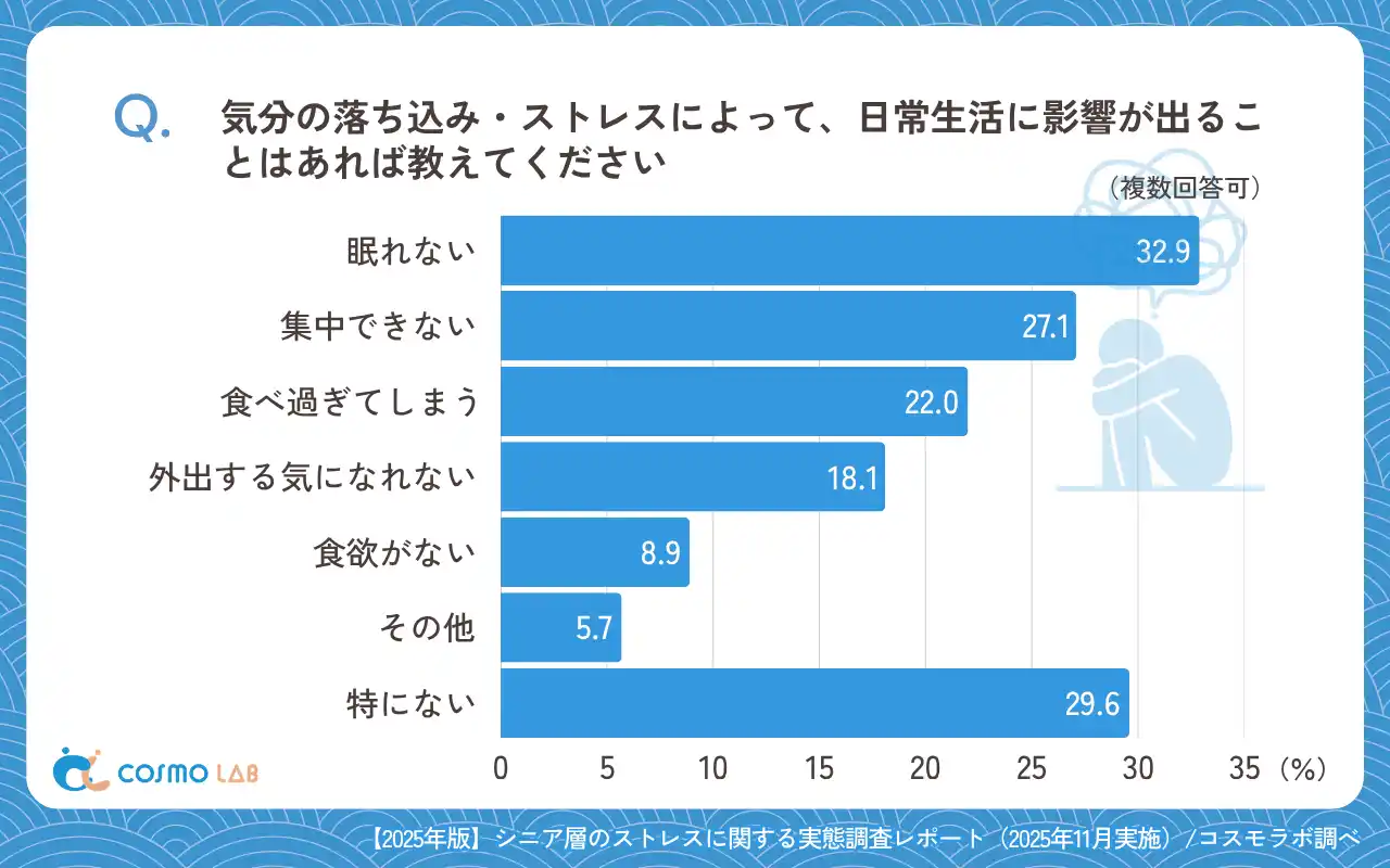 ◆影響は睡眠・集中に表れやすい 生活への影響は「眠れない」(32.9%)、「集中できない」(27.1%)が上位となりました。「食べ過ぎてしまう」(22.0%)も一定の割合で見受けられ、睡眠と食行動に影響が出ています。