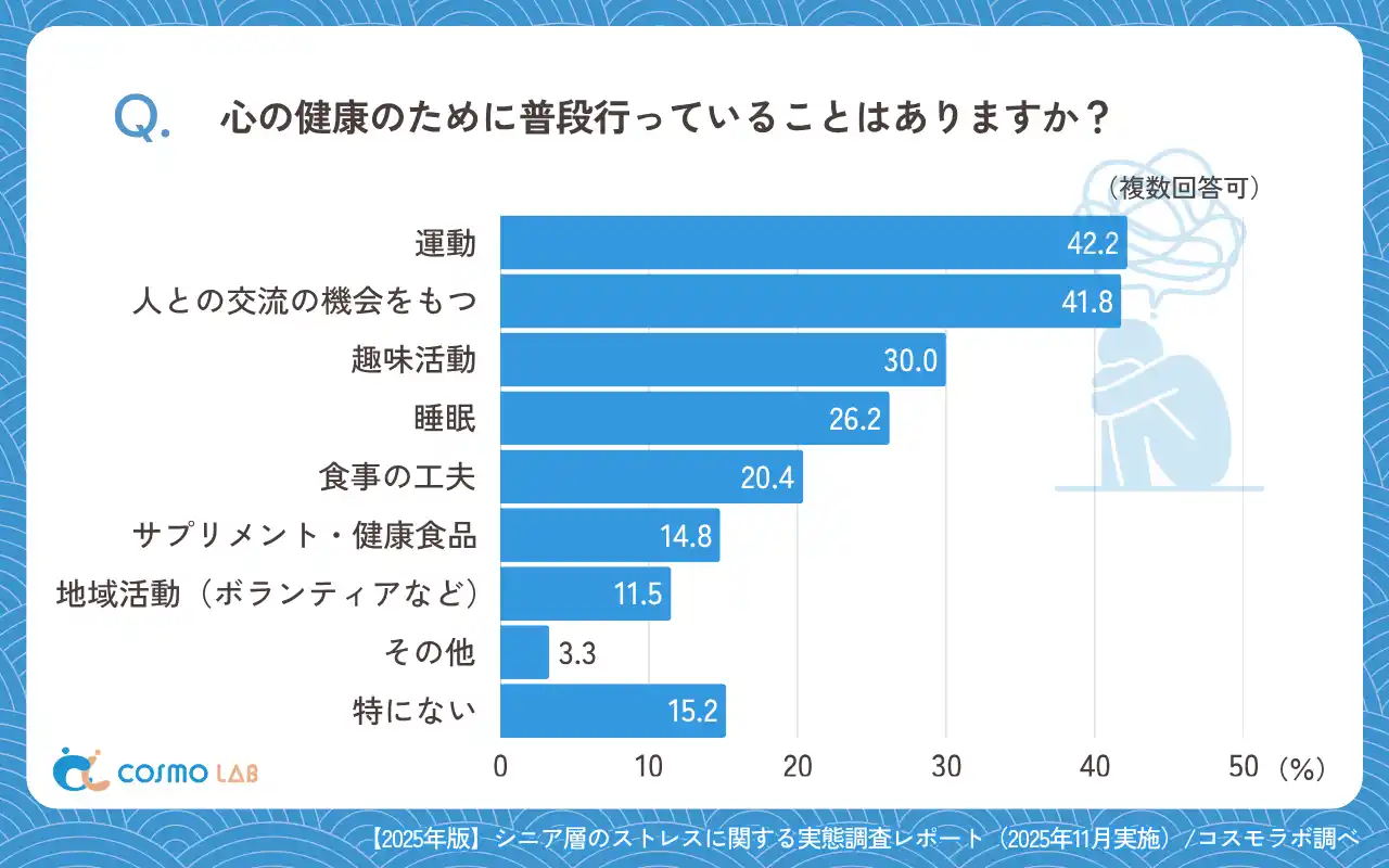 「運動」(42.2%)と「人との交流の機会をもつ」(41.8%)という回答が、同水準で上位となりました。このことから、日常の行動習慣で心の安定をはかる姿勢が明らかになりました。 |