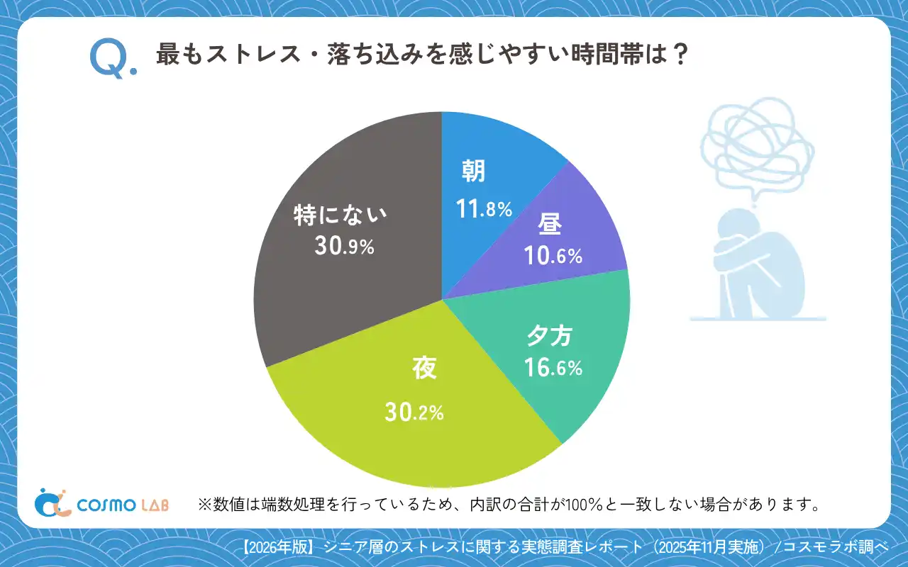 ストレスや落ち込みを感じやすい時間帯に、偏りがない層が一定数見られる一方で、夜間に感じやすい層も同規模で存在することが明らかになりました。 |