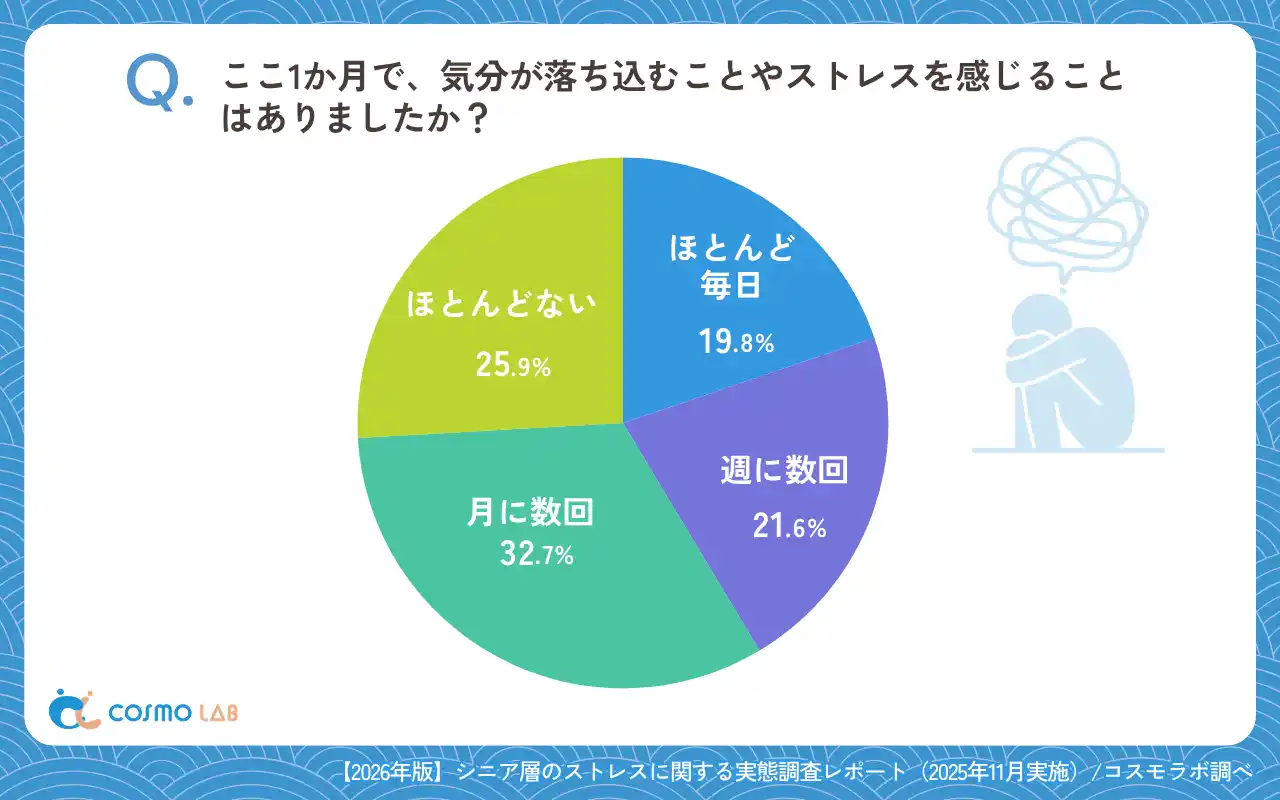 シニア専門のマーケティングプラットホーム コスモラボ(会社名:コスモヘルス株式会社、本社:東京都港区、代表取締役社長 小塚 崇史)がシニア層の『ストレス』に関するアンケートリサーチのレポートをリリースしました。本レポートでは、シニア層を対象に「ストレス・気分の落ち込み」に関するアンケート調査の結果を分析しました。