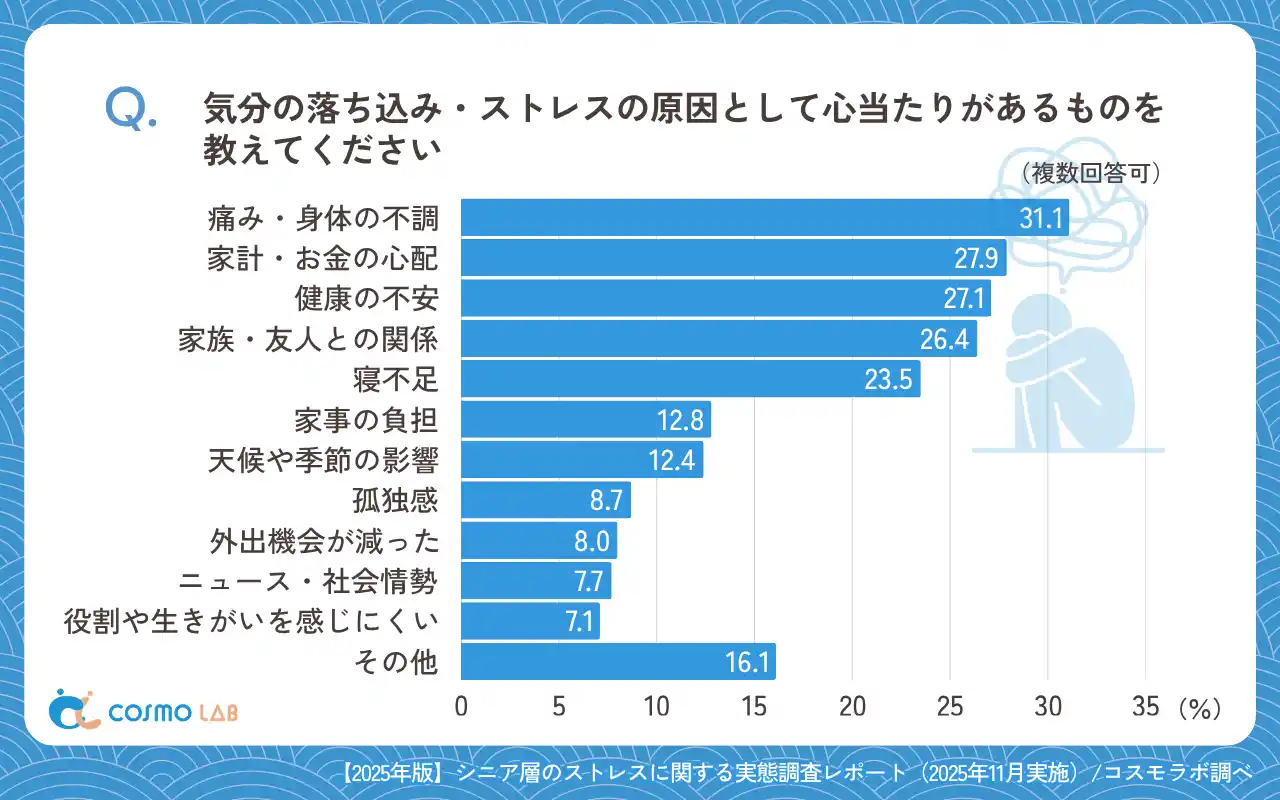 原因は「痛み・身体の不調」(31.1%)が最多で、「家計・お金の心配」(27.9%)、「健康の不安」(27.1%)、「家族・友人との関係」(26.4%)と続きました。 |