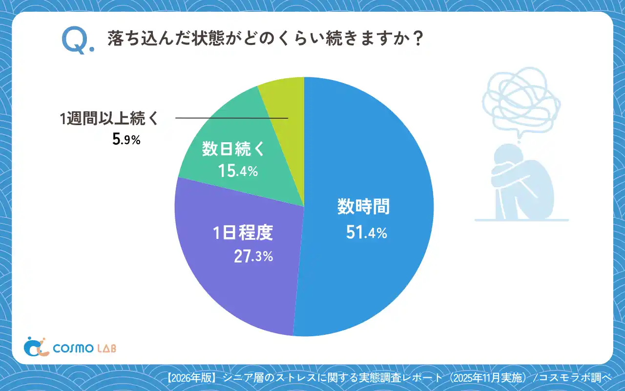 落ち込みが続くのは「数時間」(51.4%)が多数、さらに「1日程度」(27.3%)が続き、短時間で収束するケースが中心です。しかし「数日続く」(15.4%)と「1週間以上続く」(5.9%)も見られ、長引く層に向けた支援も必要です。 |