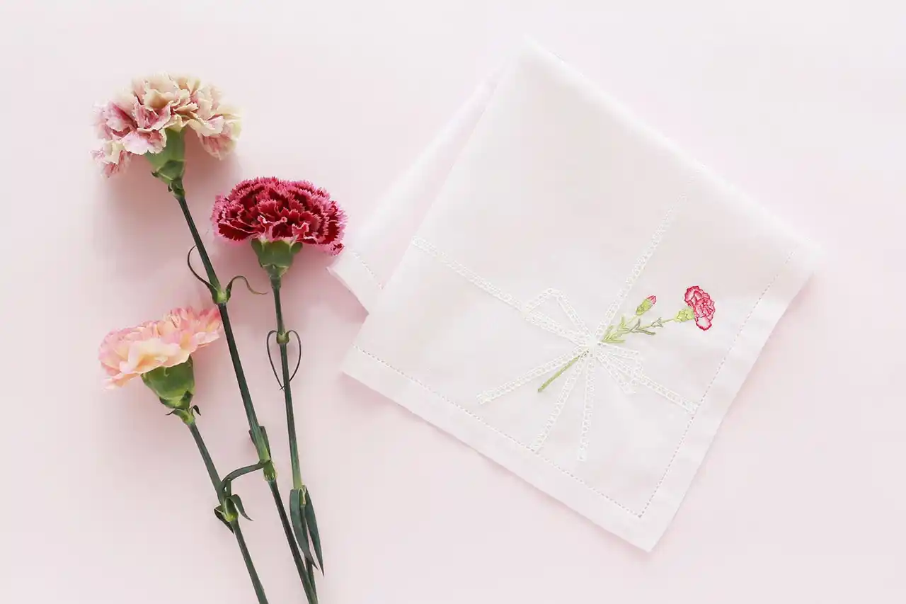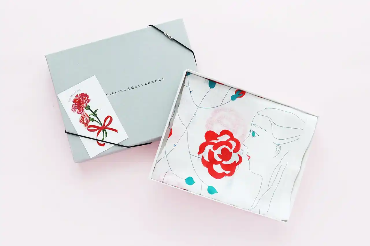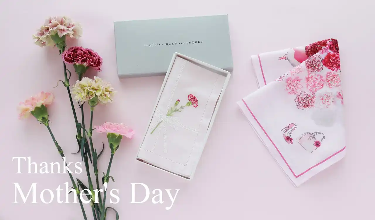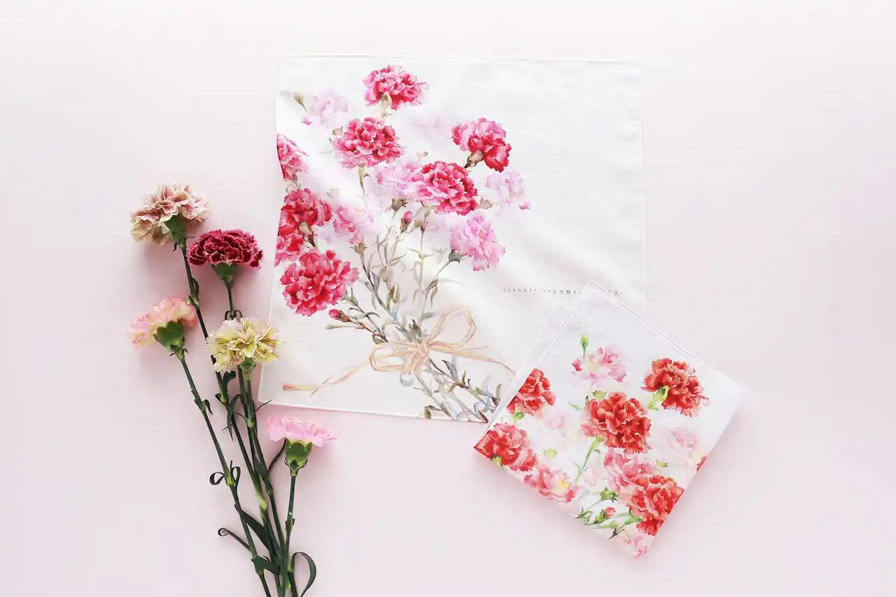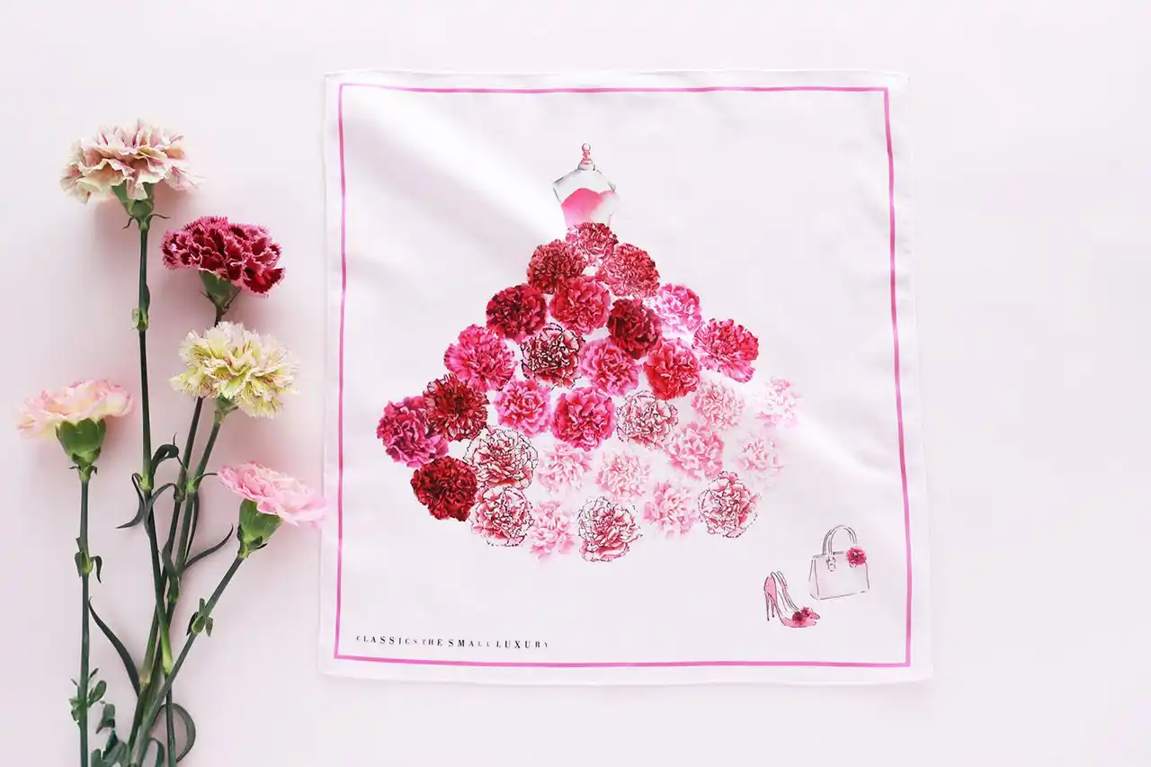 CLASSICS the Small Luxury (クラシクス・ザ・スモールラグジュアリ)は、東京、日本橋人形町を拠点に日本のハンカチーフ業界のパイオニアである、繊維製品企画販売のブルーミング中西株式会社(本社 東京都 中央区 取締役社長 中西一) が運営するハンカチーフ専門店です。その月を象徴する花をドレスに見立てて描いた「Dress in Bloom」シリーズより、「カーネーションドレス」のハンカチーフを2026年4月15日(水)より発売します。また同日より、母の日ギフトとしてハンカチーフとギフトパッケージをご購入いただいたお客様へ、オリジナルステッカーをプレゼントいたします。