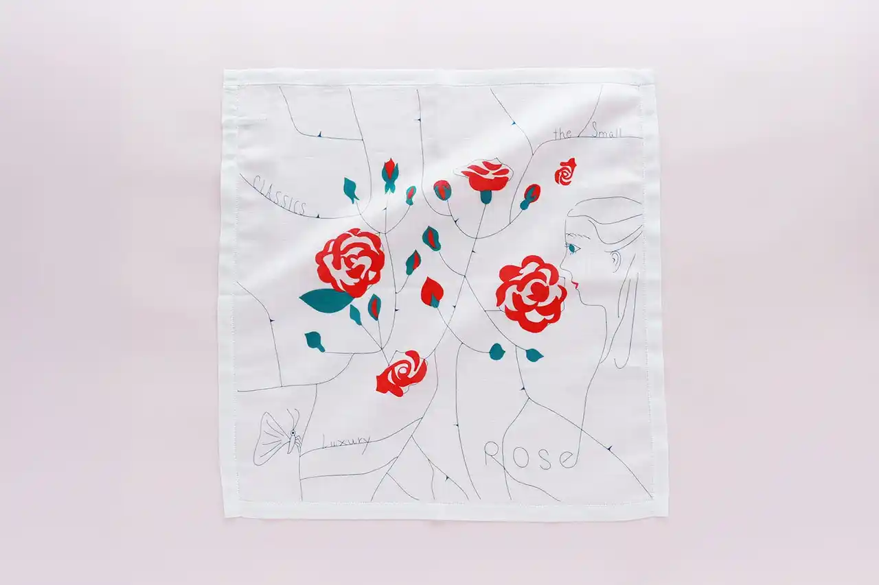 KIGIのアートディレクター/デザイナーの渡邉良重さんによる繊細なラインのイラストを、手捺染プリントで表現しました。咲き誇るバラの花に囲まれ、かぐわしい香りが漂ってきそうなハンカチーフです。 |