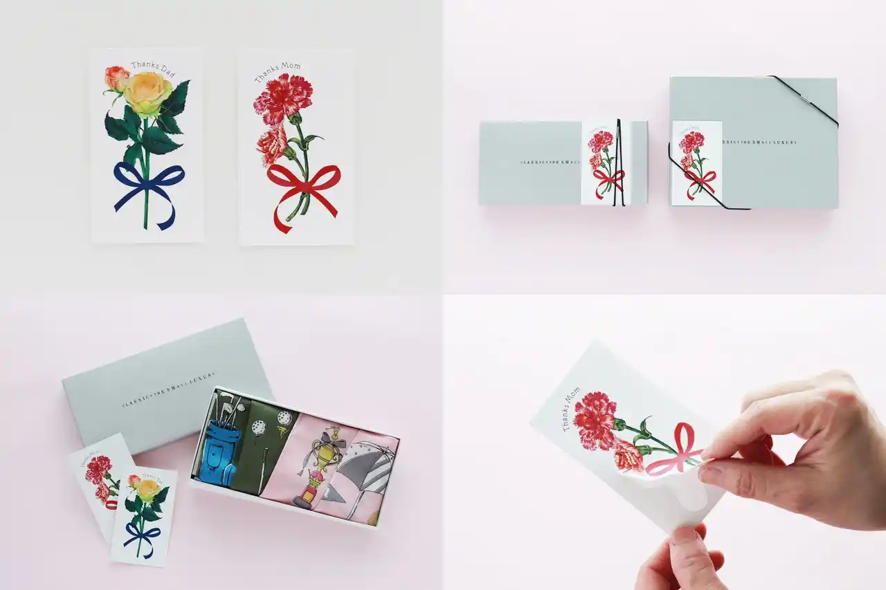 2026年4月15日(水)より、期間限定で母の日ギフトにはカーネーションを、父の日ギフトにはバラをモチーフにした、オリジナルステッカーをご用意いたします。母の日、父の日を合わせて、ご両親へのギフトとしてお選びいただくのもおすすめです。 |