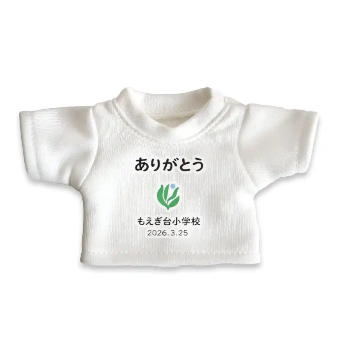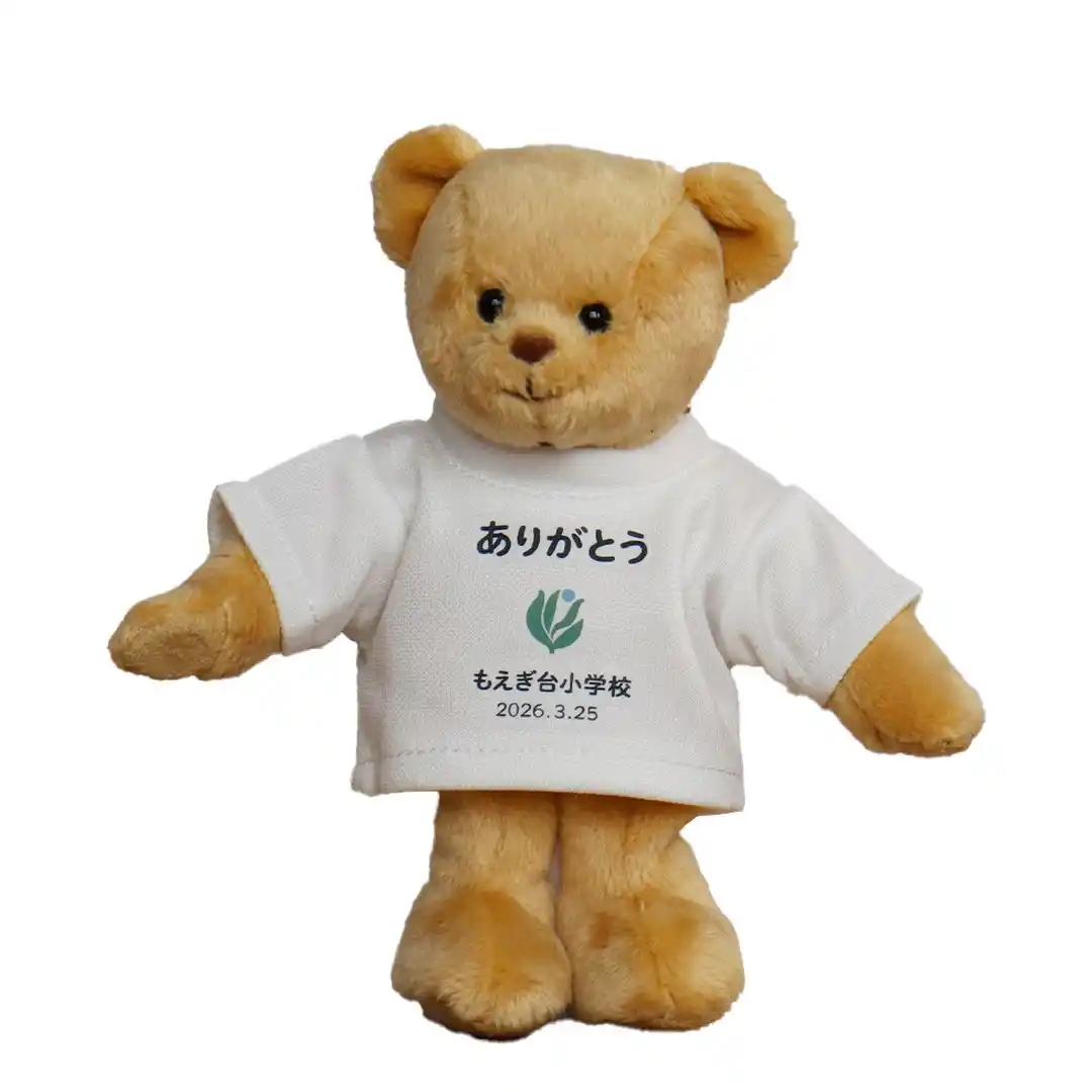 今回、全児童や教職員へと贈られた160個の記念品は、手のひらサイズの可愛らしいテディベアです。着用している小さな白いTシャツの胸元には、もえぎ台小学校の校章と、「ありがとう」「もえぎ台小学校」「2026.3.25」という閉校の日の日付が鮮やかにプリントされています。 |