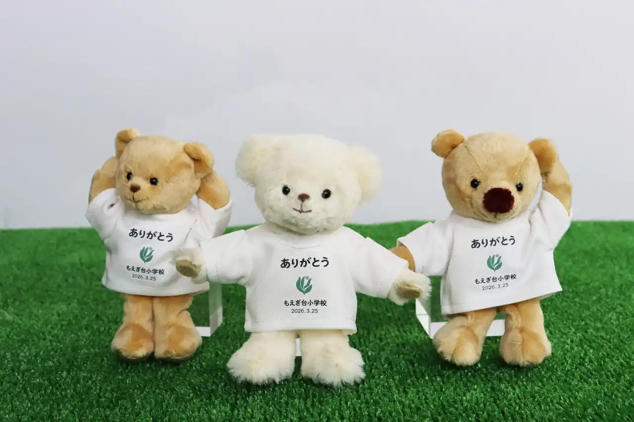 オリジナルテディベアの企画・製造・販売を行う株式会社プティルウ(所在地:大阪府泉佐野市、代表取締役社長:長田耕太)は、2026年3月をもって25年の歴史に幕を下ろした神奈川県相模原市立もえぎ台小学校の閉校記念品として、同校PTA様よりご依頼を受け、学校名や校章をプリントした「ロゴ入りベア」160個を製作・提供いたしました。子どもたちの新たな門出をそっと見守る、心温まる記念品となっています。 |