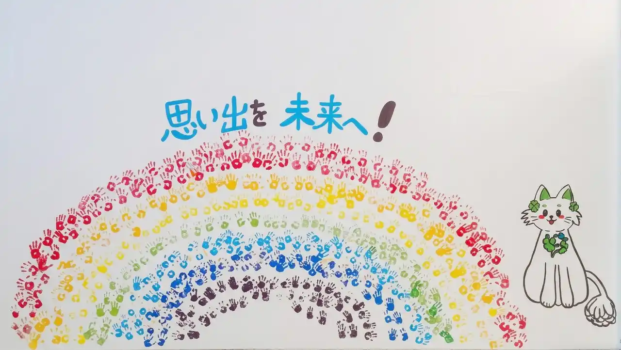 閉校に向けた活動の中で、校内には児童たちの手形で描かれた色鮮やかな大きな虹の壁画が制作されました。そこには、学校のマスコットキャラクター「もえにゃん」とともに、『思い出を未来へ!』という力強いメッセージが記されています。 |