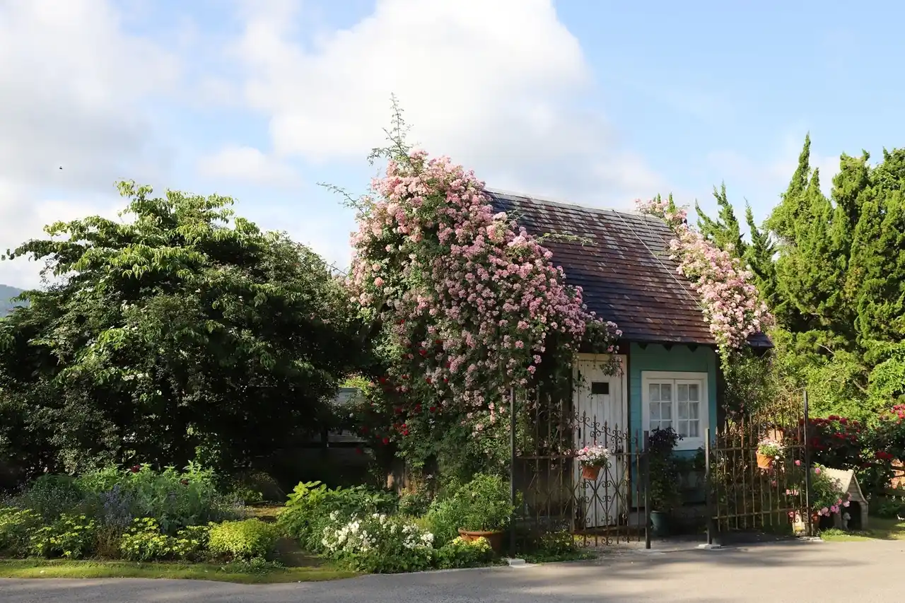 約1300平方メートル におよぶ本格的なイングリッシュガーデンは、バラや宿根草が自然な植生を活かして混植され、計算された色彩設計と奥行きに圧倒されます。特に初夏のバラとクレマチスの共演は見事。季節ごとに表情を変える「五感に響く庭」は、自宅の庭づくりのインスピレーションの宝庫です。 |