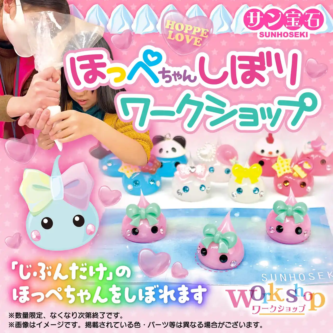 つぶらな瞳とキラキラほっぺ、ぷにぷにな感触がクセになる!15周年を迎えた〈サン宝石〉オリジナルキャラクター「ほっぺちゃん」のコラボグッズやワークショップをお楽しみいただけます。 |