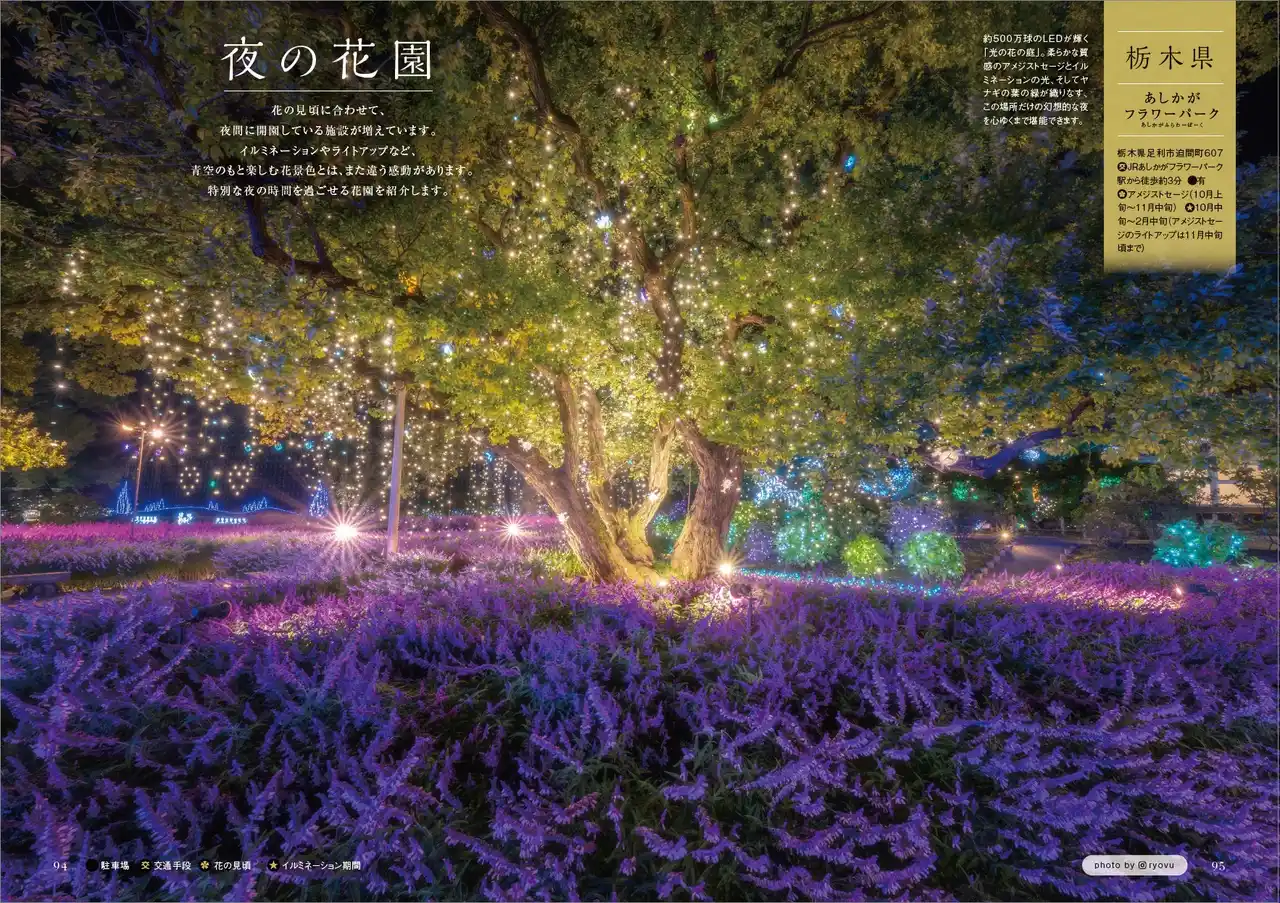 また、各施設の見どころポイントでは、おすすめの撮影時間や撮影スポット、花以外に楽しめる見どころやイベントなども紹介。現地をより深く楽しむためのヒントが詰まっています。 |
