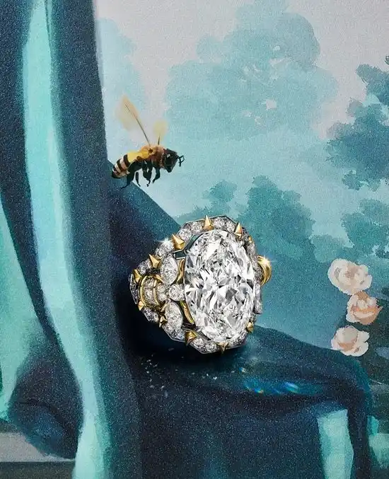 「ビー」は、シュランバージェのアイコニックな「ツー ビーズ」リングに着想を得て、ハニカム構造を思わせる格子状のデザインと有機的な動きが織りなす、洗練された造形を探求しています。オーバルカット ダイヤモンドは、18Kイエローゴールドで彩られた幾何学的な六角形の中に配され、中心には10カラットを超えるDカラー、インターナリー フローレスのオーバル ダイヤモンドを据えたリングが登場します。そこには、ひそやかに配されたミツバチのモチーフが繊細に縁取られています。 |
