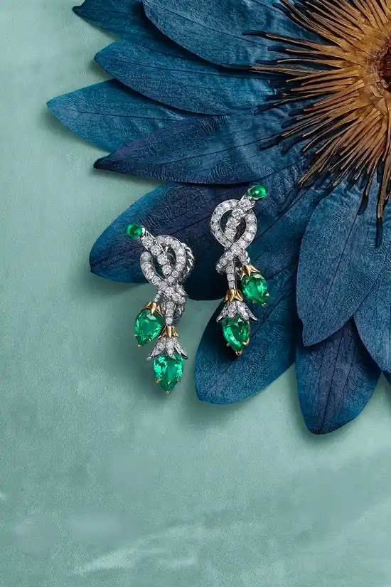 「ツイン バッド」のストーリーは、シュランバージェのアーカイブ モチーフを再解釈し、絡み合いながら交差する精緻なプラチナの蔓によって表現しています。鮮やかな非加熱ザンビア産エメラルドと輝きを放つダイヤモンドの組み合わせにより、二つのつぼみが、はかない瞬間に宙に浮かんでいるかのような印象を与えます。エメラルドのセットでは、ペアシェイプとカボションカットのエメラルドが美しく調和し、彫刻的な蔓の上に生き生きとしたつぼみを描き出します。そこにブライトカットやカットダウン
