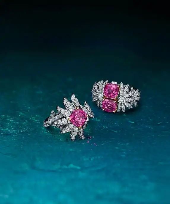 「パーム」は、しなやかにねじれる葉の造形の中に、モザンビーク産の非加熱オーバルカット ルビーをあしらい、コレクションを締めくくります。鮮やかな色彩と輝きを備えたこれらのルビーは、精緻に選び抜かれたジェムストーンを扱うティファニーの伝統を体現しています。また、もうひとつのセットでは、ダイヤモンドが滝のように流れ落ちるかのように配され、陽光を受けた葉の動きと輝きを捉えています。 |
