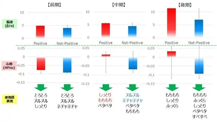 | 塗布時間を感触の変化(図2)に合わせて分割した結果、前期では差が見られない一方で、使い心地に変化を感じる中期以降において、Positive群では副交感神経活動の指標となるHFnuが正の値に上昇し、快方向に移行する傾向が見られました(図3)。また、そのときに感じる使い心地について、Positive群では「しっとり」「もちもち」と表現されるのに対し、Not-Positive群では「ヌルヌル」「ネチャネチャ」と、異なる表現をされることが確認されました。一方、肌の仕上がり感を感じる後期では、引き続きPositive群のHFnuは快方向、Not-Positive群は不快方向のままでしたが、使い心地は両群ともに「もちもち」「しっとり」「ふっくら」といった同じ表現型となりました。 | |||