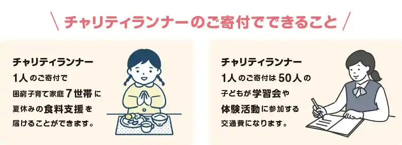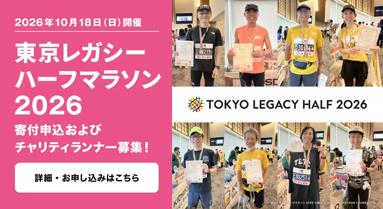 2026年10月18日(日)に開催が予定されている東京レガシーハーフマラソンチャリティは、東京レガシーハーフマラソンを通して、チャリティ活動の輪を広げる取り組みです。寄付先団体が設定する寄付金額以上をいただいた方の中でご希望の方は、チャリティ活動をアピールしていただくチャリティランナーとして東京レガシーハーフマラソン2026に参加することができます。この度、東京マラソン2026チャリティの寄付先団体であるキッズドアも参加が決定し、本日から寄付申込およびチャリティランナーの募集を開始しました! |