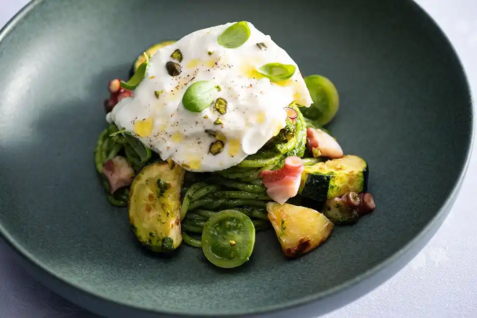 “ブッラータチーズと楽しむ”タコとズッキーニのジェノベーゼパスタ |