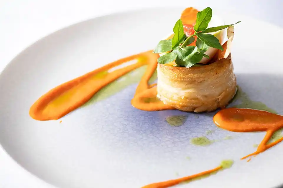 スパイシーな野菜のトマト煮込みに蒸し穴子を巻き付け、美しいガトー仕立てに。能勢おうはんの半熟玉子と生ハムチップスとともにお楽しみください。フランスとスペインにまたがるバスク地方の郷土料理「ピペラード」をベースにアレンジした一皿。 |
