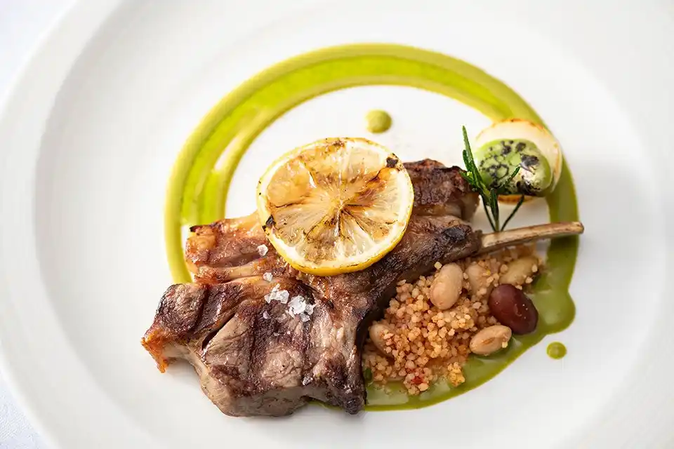 赤身と脂肪のバランスがよく、食べやすいラムチョップを香ばしくグリルに。 |