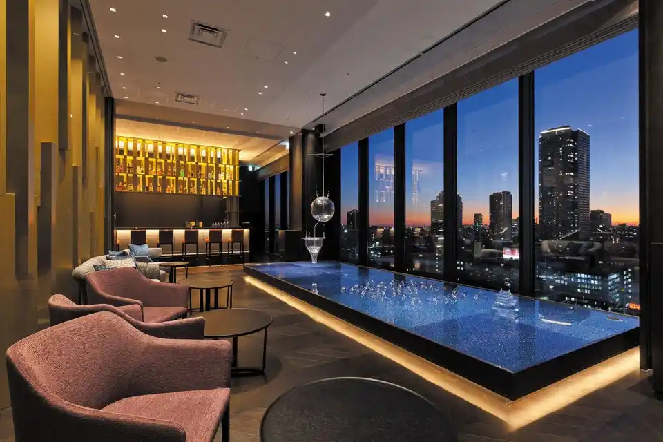 水都大阪をイメージした水盤、職人技が光る天満切子の照明が織りなすドラマチックな空間で至極の一杯をお愉しみください。 |