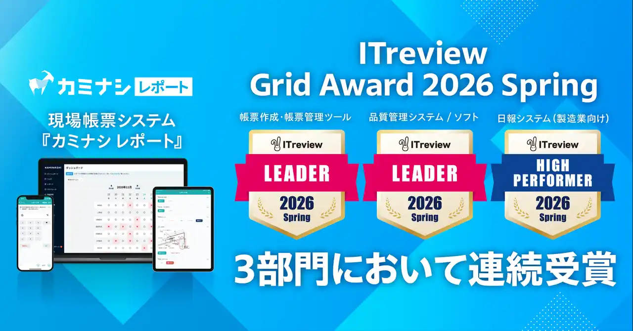 | 株式会社カミナシ(本社:東京都千代田区、代表取締役:諸岡 裕人、以下「カミナシ」)が提供する現場帳票システム『カミナシ レポート』は、アイティクラウド株式会社(本社:東京都港区、代表取締役社長兼CEO 黒野源太、以下「アイティクラウド」)が主催する「ITreview Grid Award 2026 Spring」において、「帳票作成・帳票管理ツール」部門で最高位の「Leader」を8期連続、「品質管理システム/ソフト」部門で同じく最高位の「Leader」を7期連続、そして「日報システム(製造業向け)」部門で「High Performer」を7期連続で受賞しました。 | |||||