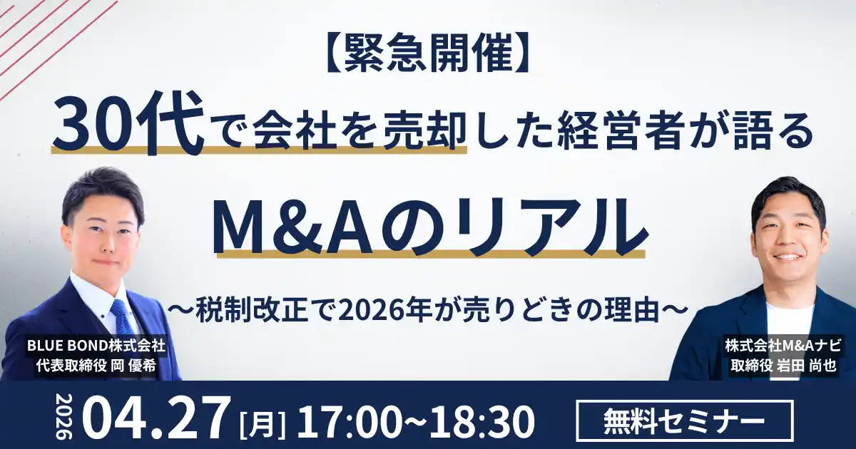 M&Aテクノロジーを展開する株式会社M&Aナビ(本社:東京都品川区、代表取締役:瀧田 雄介、以下「当社」)は、2026年4月27日(月)17:00より、オンライン無料セミナー「30代で会社を売却した経営者が語るM&Aのリアル~税制改正で2026年が売却タイミングを検討すべき理由~」を開催します。 |
