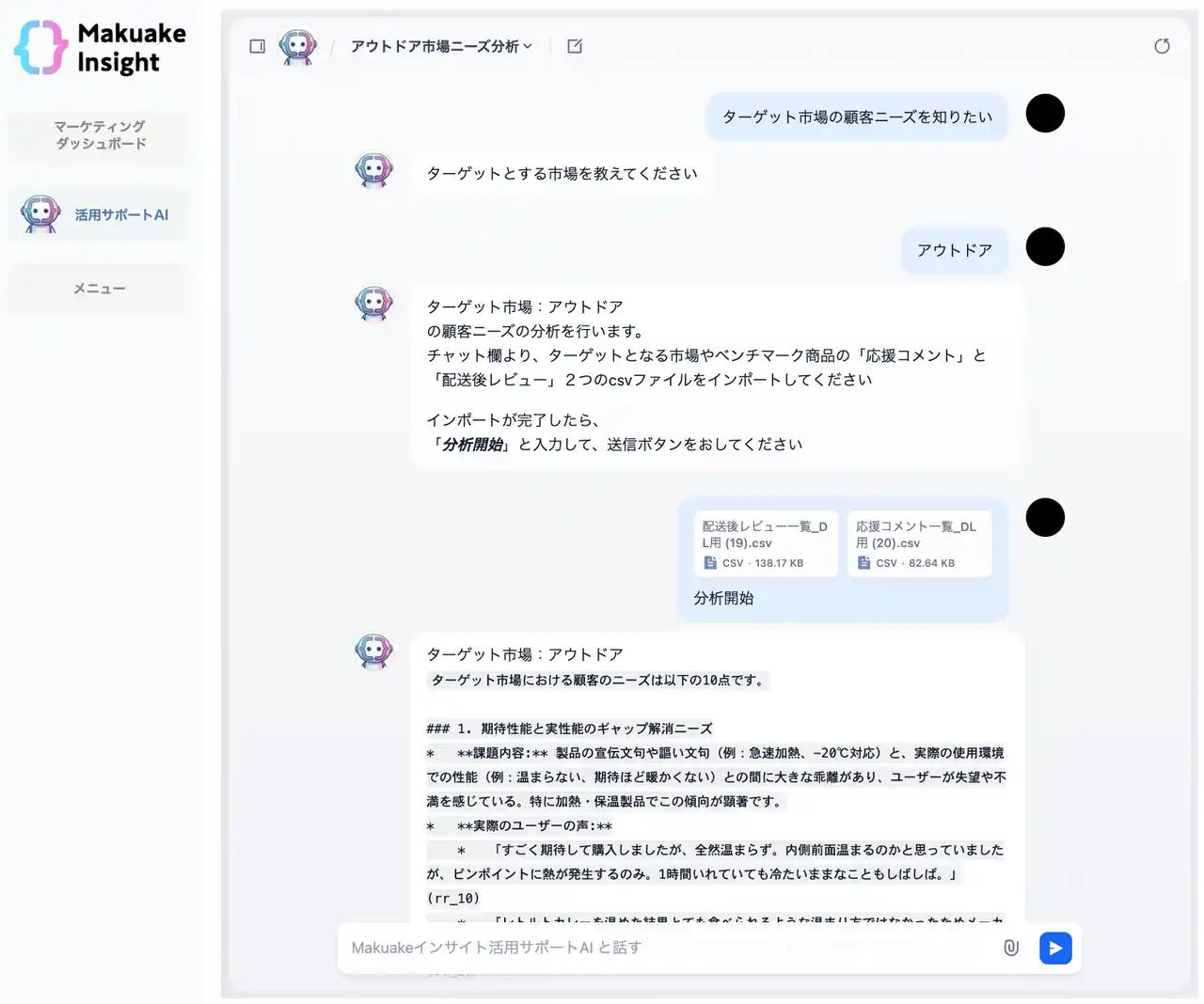 アタラシイものや体験の応援購入サービス「Makuake(マクアケ)」を運営する株式会社マクアケ(以下、当社)は、生活者の声と行動データから確信ある意思決定を生み出す新商品開発支援ツール「Makuakeインサイト」において、新たにAI機能を搭載します。 |
