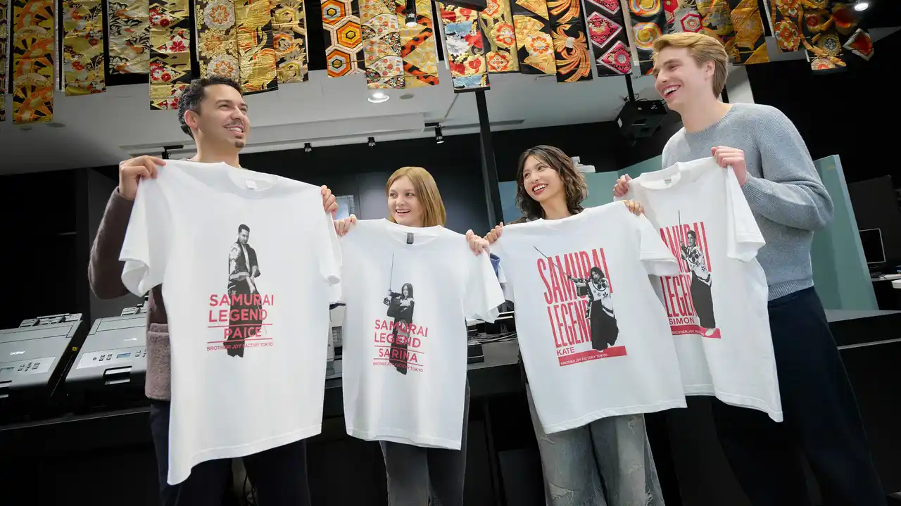 侍装束に着替え、超大型ビジョンに映る師範に合わせて刀を振ることで、映像演出と連動した「侍アクション体験」を楽しめる。ゲストの演武姿はAI処理によってさらに美しく、力強いビジュアルに変換され、その場でプリントされたオリジナルTシャツとして持ち帰ることができる。さらに缶バッジやマグカップなどのグッズを作成することも可能【※1】。また、体験のハイライトはショート動画に生成され体験後すぐにゲストに送信されるので、旅先での「主役体験」をそのまま世界中の友人やフォロワーにSNSなどを通じてシェアすることもできる。 |