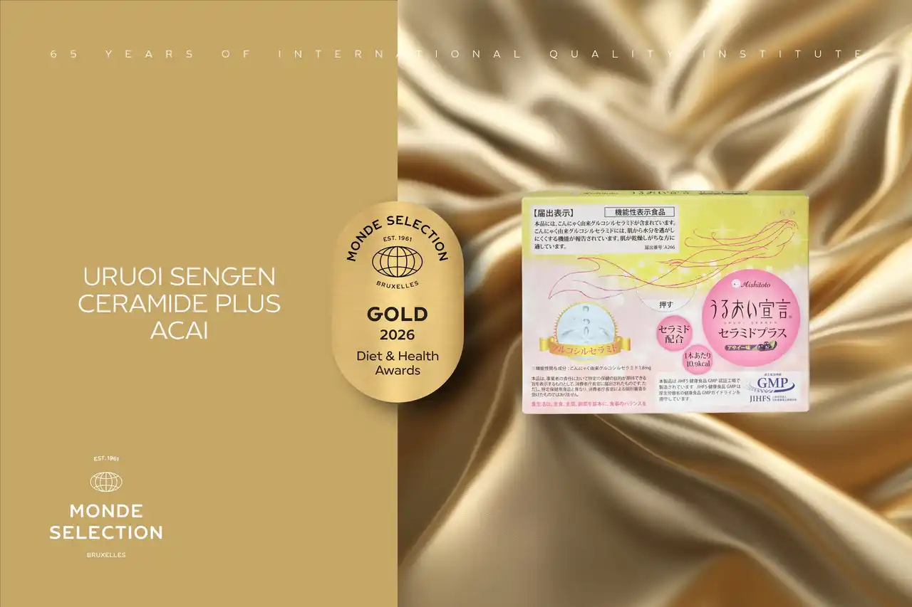 機能性表示食品で、コラーゲンとセラミドを手軽に摂れる美味しい美容系サプリ「うるおい宣言セラミドプラスアサイー味」も、8度目の金賞受賞で、その品質の高さが証明されました。 |