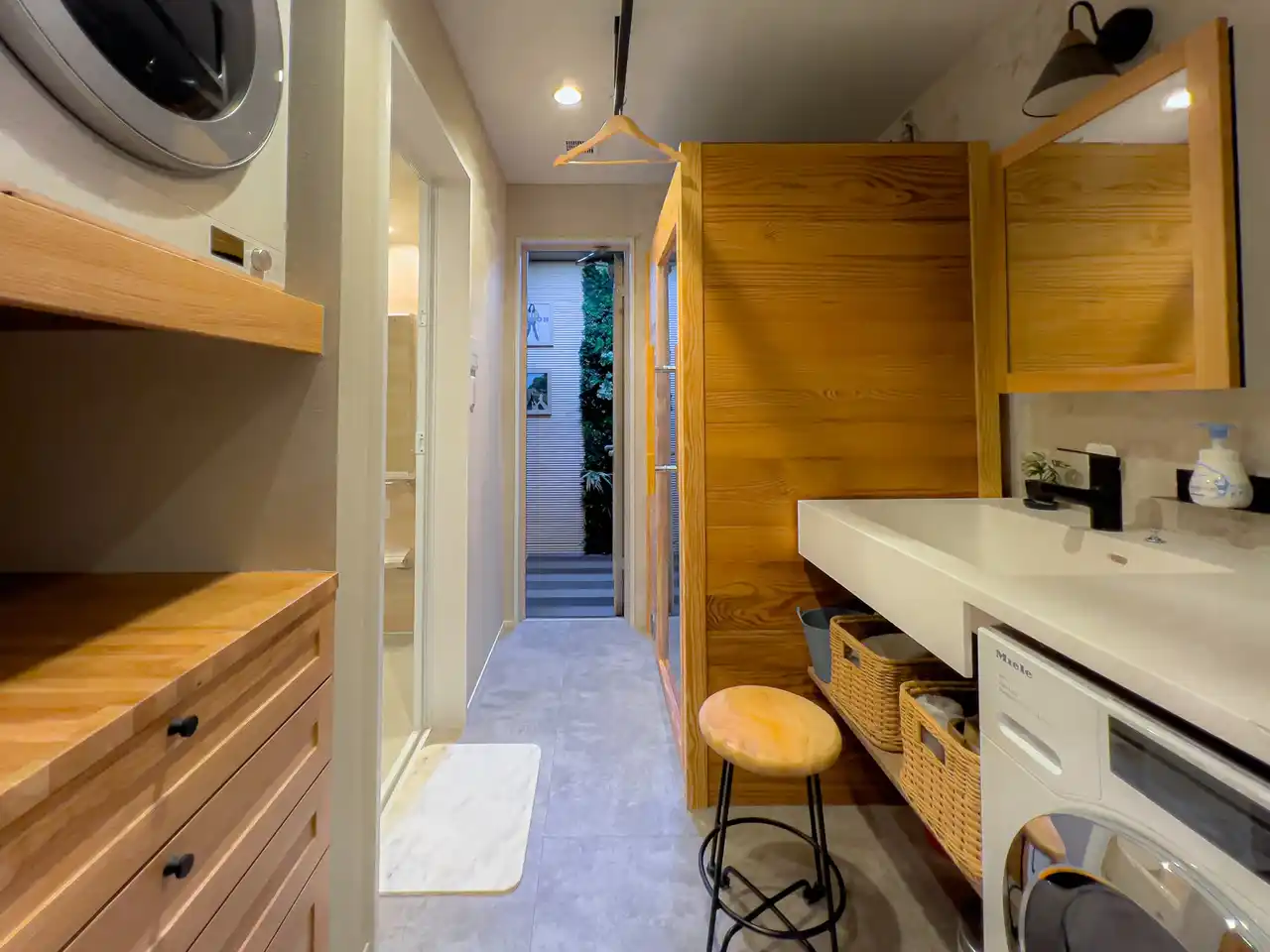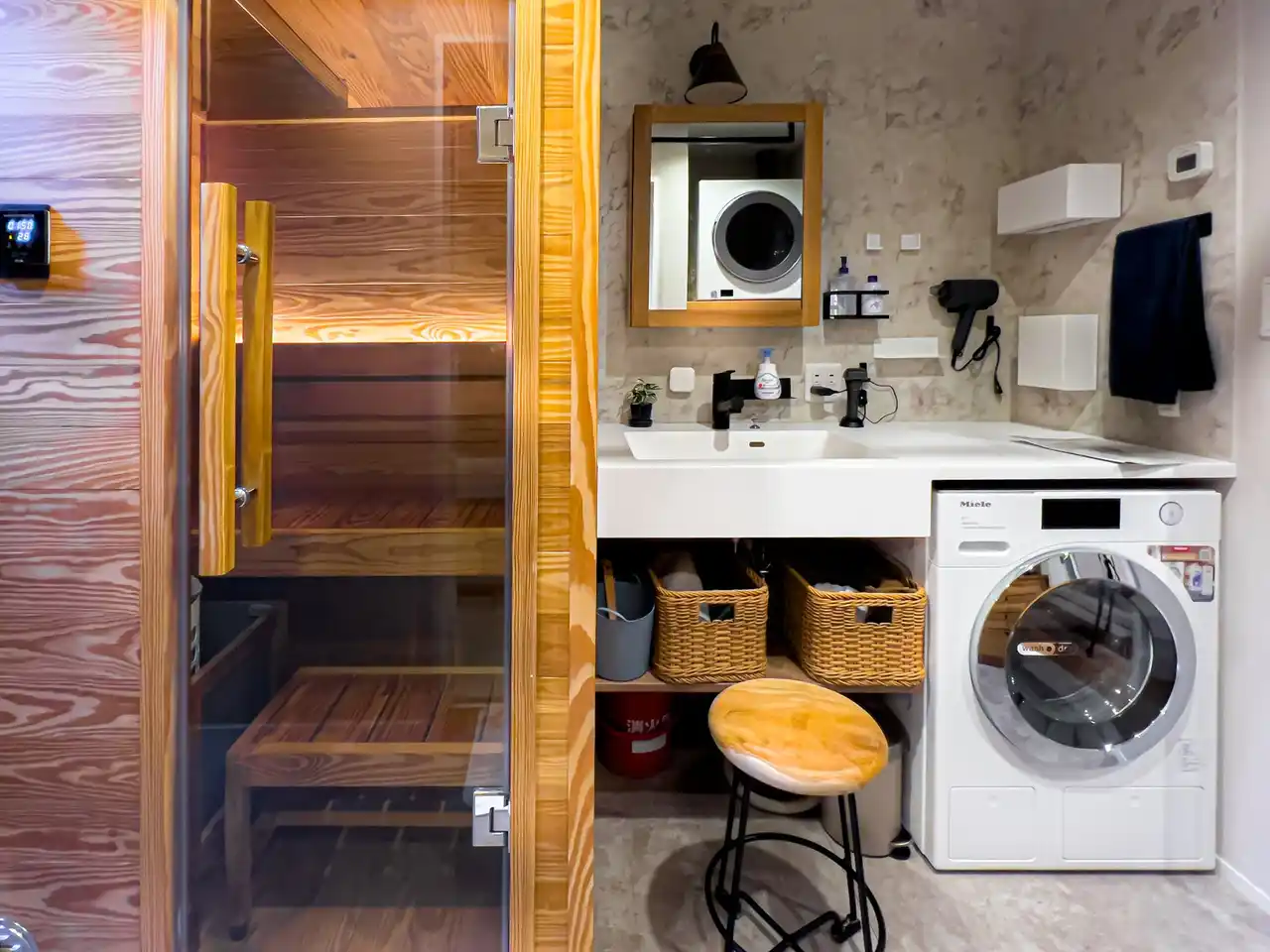 | SK Laboは、サウナ室だけを切り取るのではなく、洗面脱衣所・浴室・内気浴スペース・リビング・キッチン・デッキを含む生活空間全体をひとつの流れとして設計。「家に帰ってサウナに入り、シャワーを浴びて、休憩して、ご飯をつくる」という暮らしのひとこまを、そのままラボで追体験できます。 | ||||||||||||||||||||||